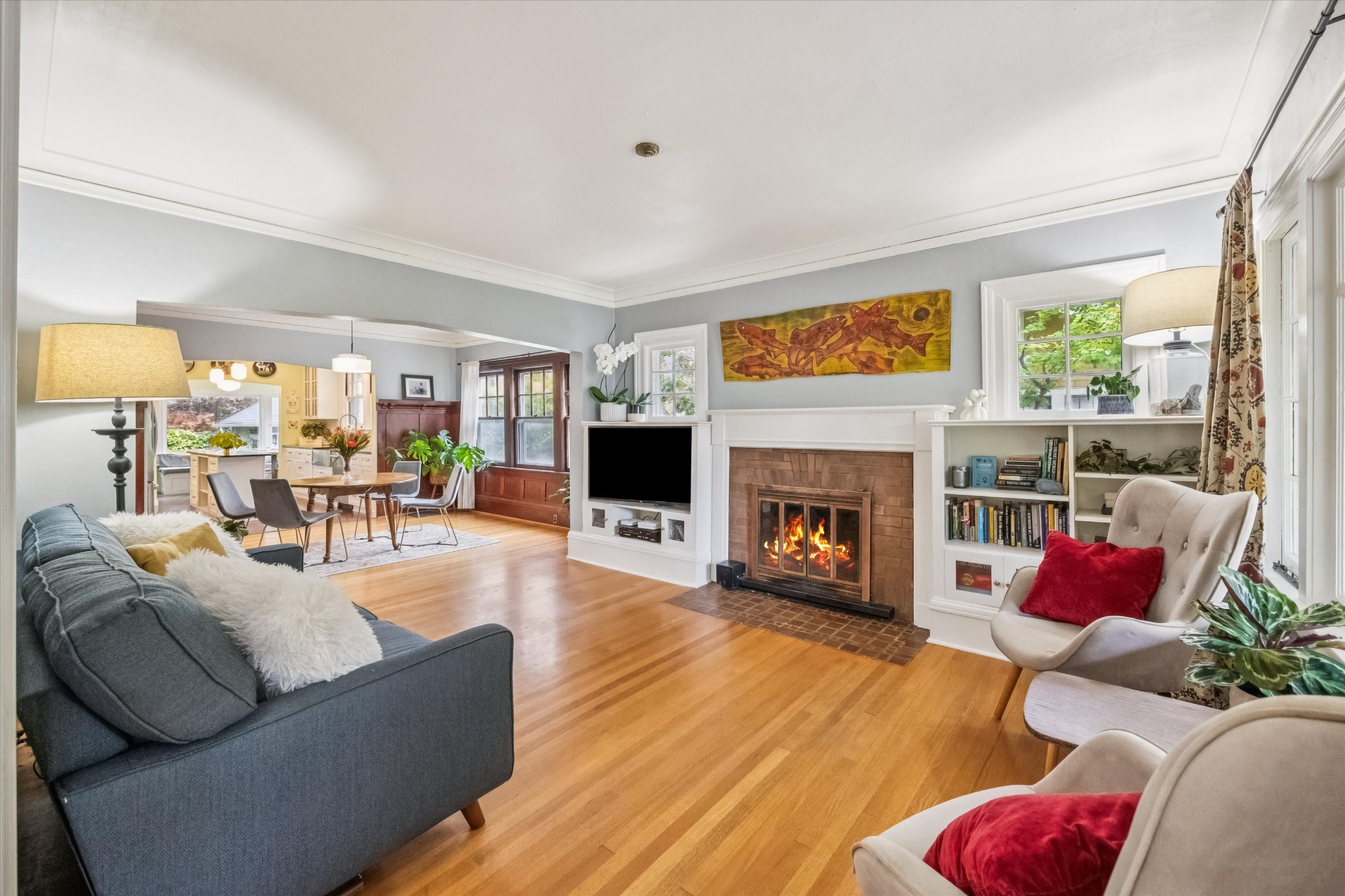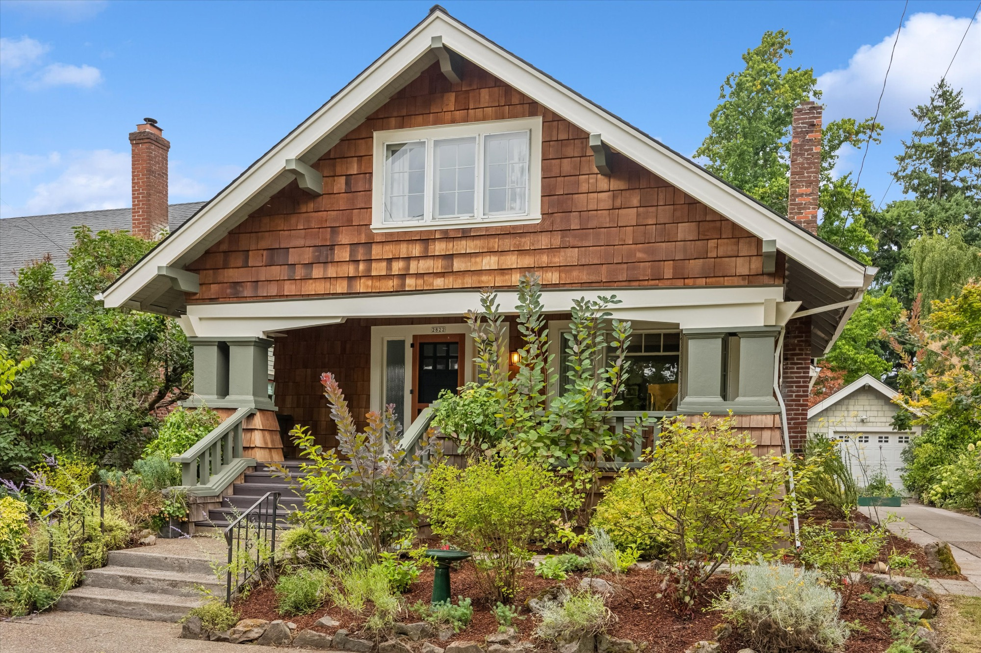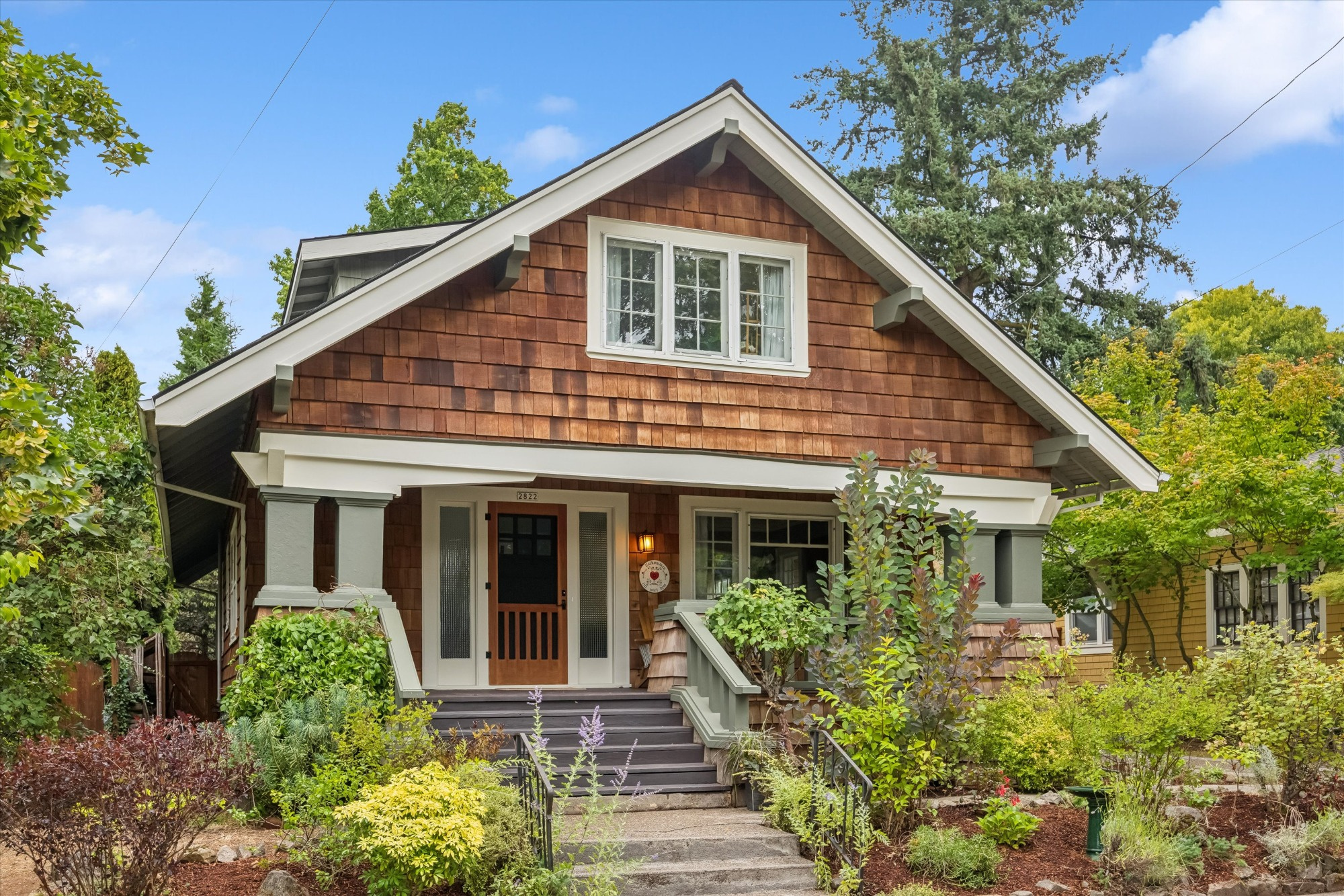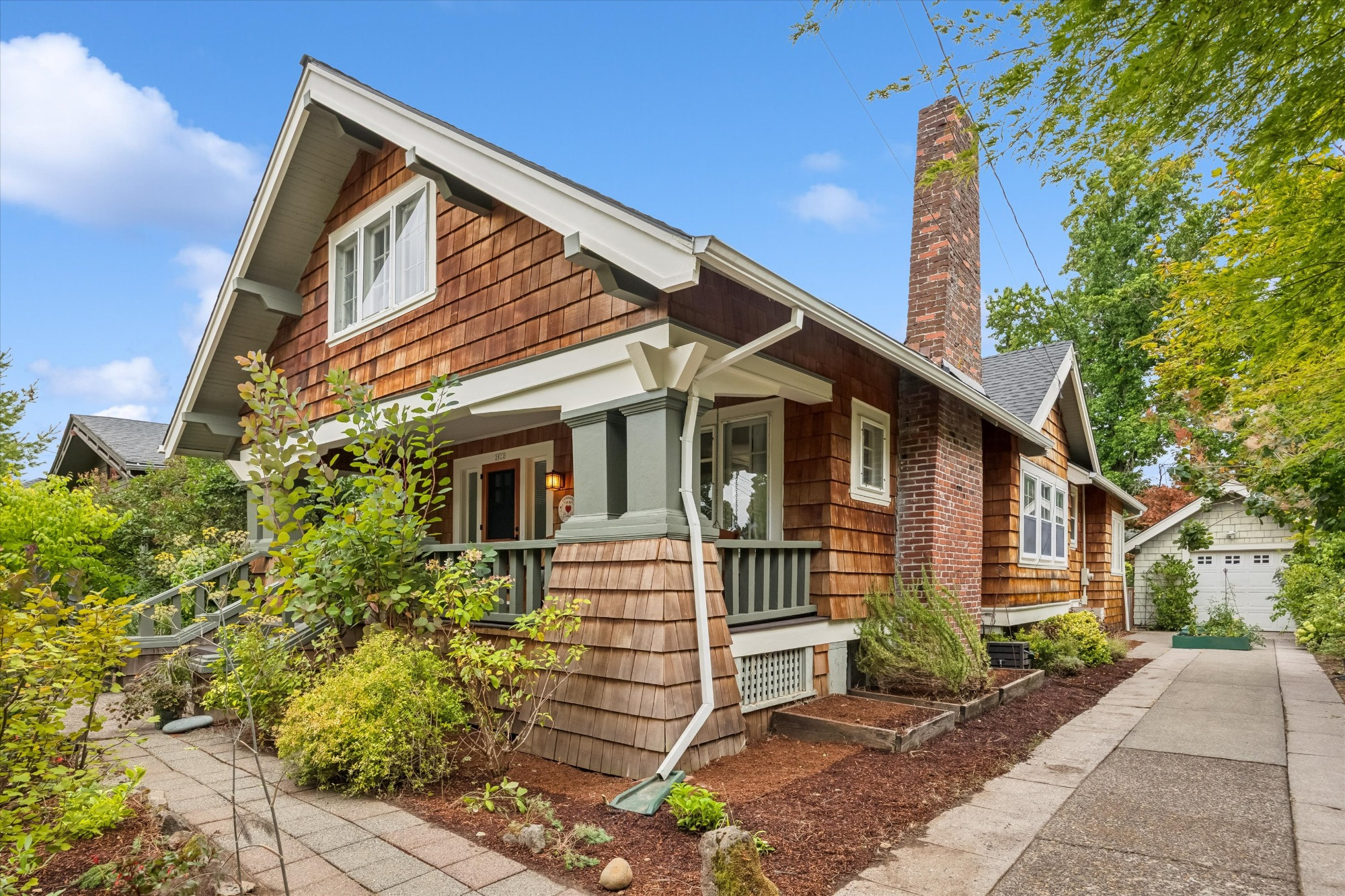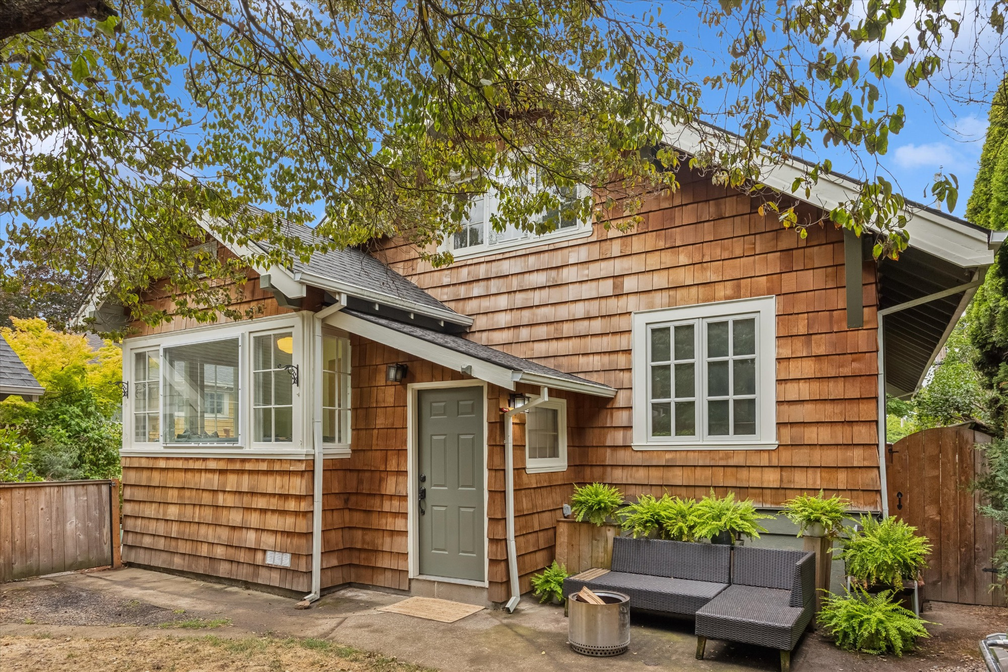 Charming Alameda bungalow with a front porch that dreams are made of and gorgeous stained cedar shake siding. The living room has a wood fireplace and gorgeous wood floors that continue through the rest of the main floor. The dining room features stained wood waincoating and trim. The updated kitchen is a chef's delight with an island, a plethora of storage and high-end Bosch appliances including the gas range. Ann Sacks tile and Schoolhouse Electric lighting in kitchen. Two bedrooms on the main floor with the primary suite upstairs is the perfect layout. The basement features a family room and the fourth (non-conforming) bedroom. Plus lots of storage. The fenced back yard and patio are perfect for summer entertaining. Oversized detached one car garage and private driveway. New roof in 2023. New carpet. Walk Score-84 and Bike Score-88.