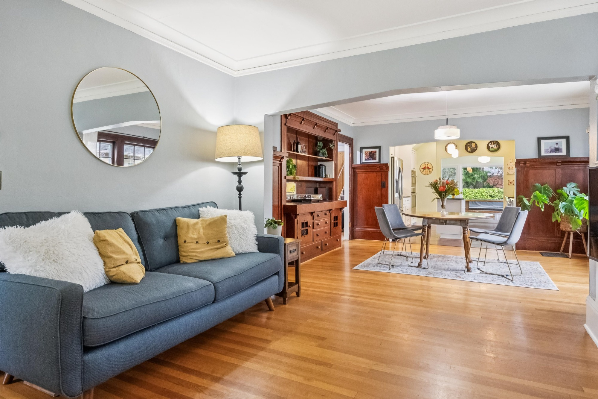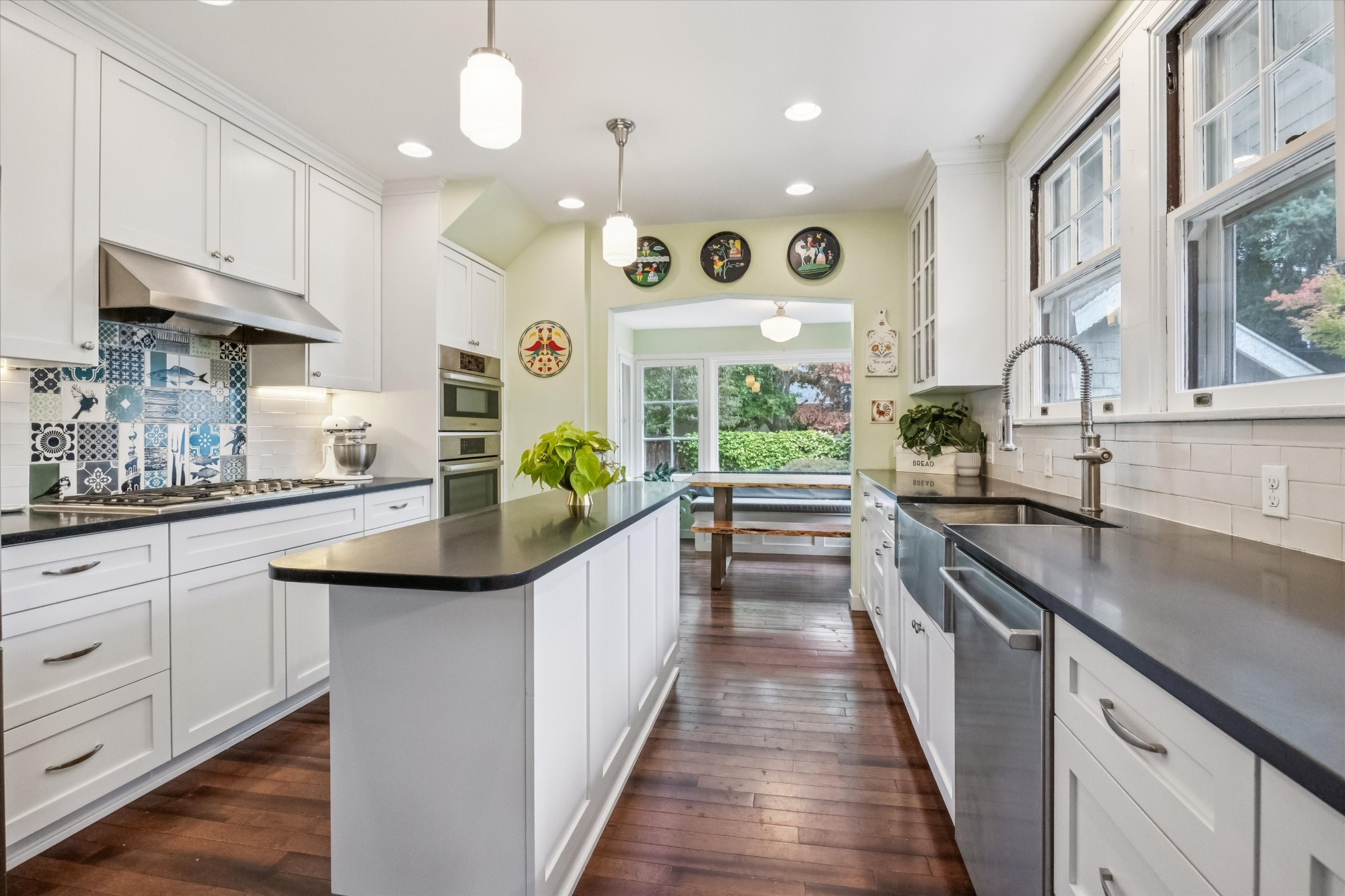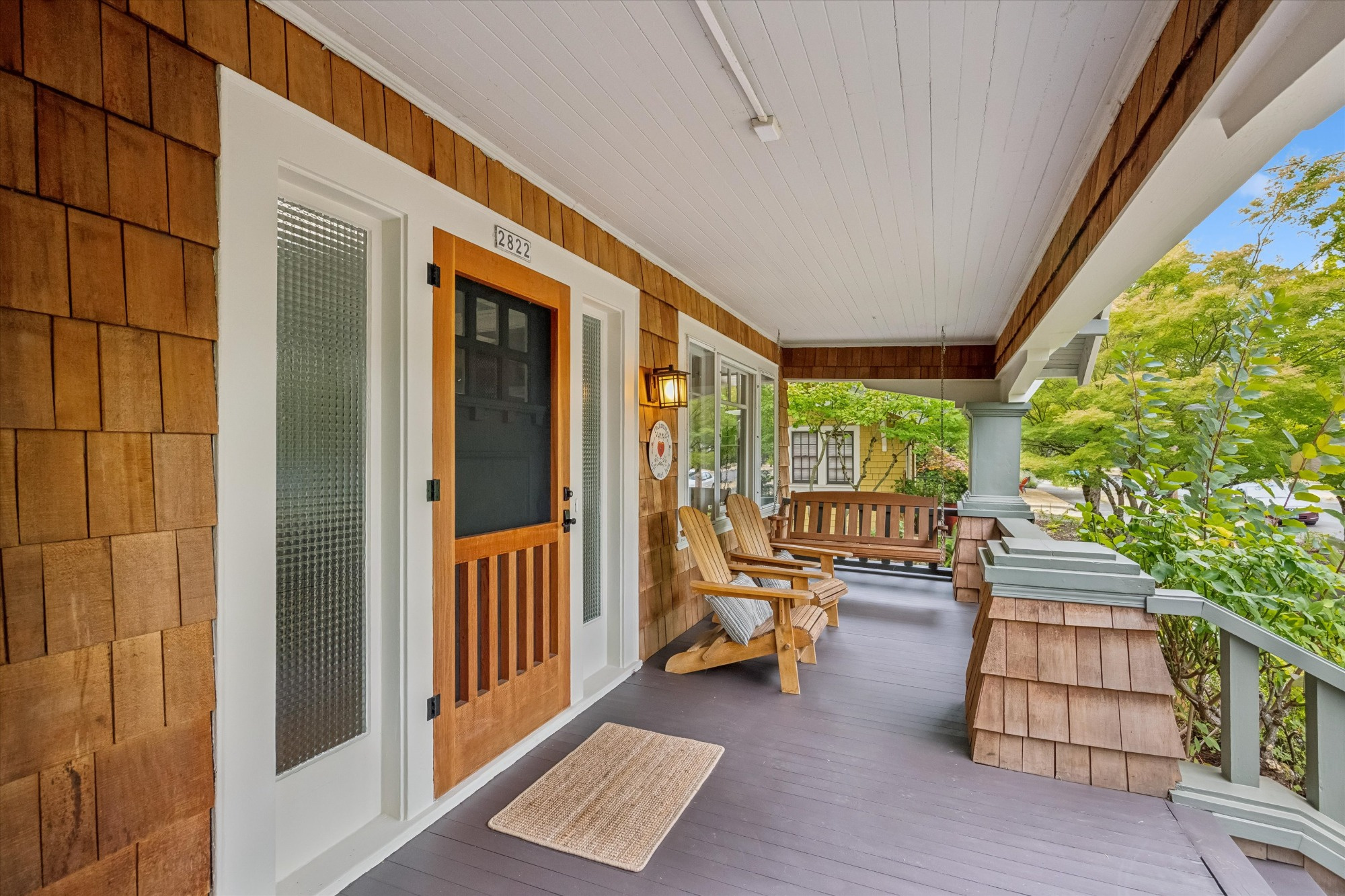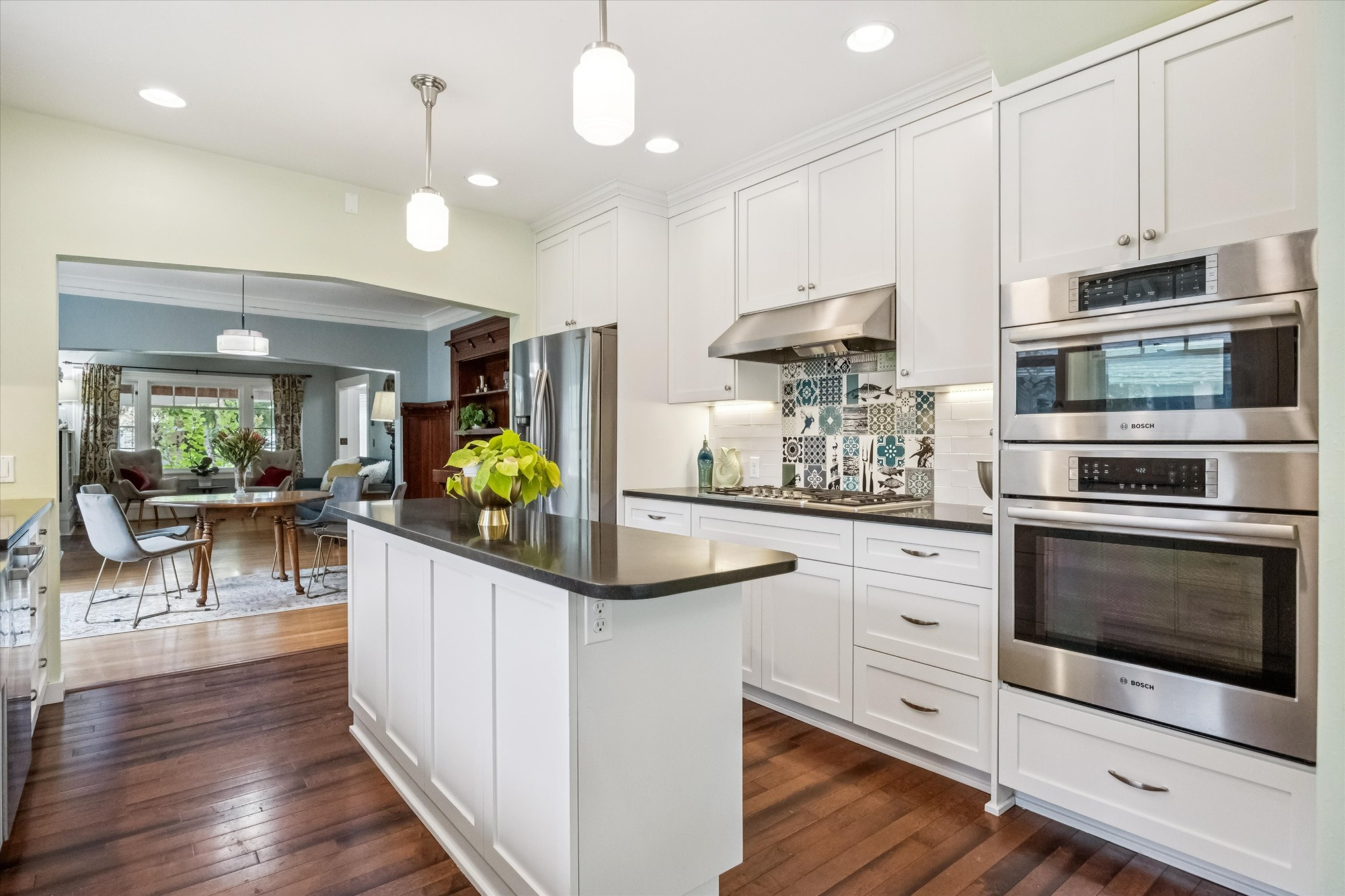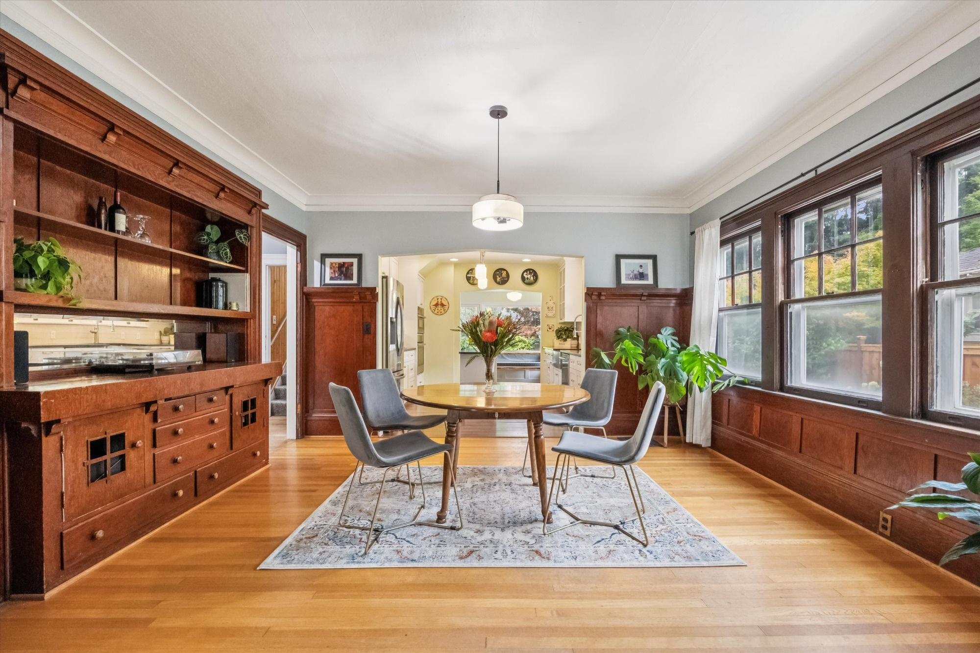 Charming Alameda bungalow with a front porch that dreams are made of and gorgeous stained cedar shake siding. The living room has a wood fireplace and gorgeous wood floors that continue through the rest of the main floor. The dining room features stained wood waincoating and trim. The updated kitchen is a chef's delight with an island, a plethora of storage and high-end Bosch appliances including the gas range. Ann Sacks tile and Schoolhouse Electric lighting in kitchen. Two bedrooms on the main floor with the primary suite upstairs is the perfect layout. The basement features a family room and the fourth (non-conforming) bedroom. Plus lots of storage. The fenced back yard and patio are perfect for summer entertaining. Oversized detached one car garage and private driveway. New roof in 2023. New carpet. Walk Score-84 and Bike Score-88.