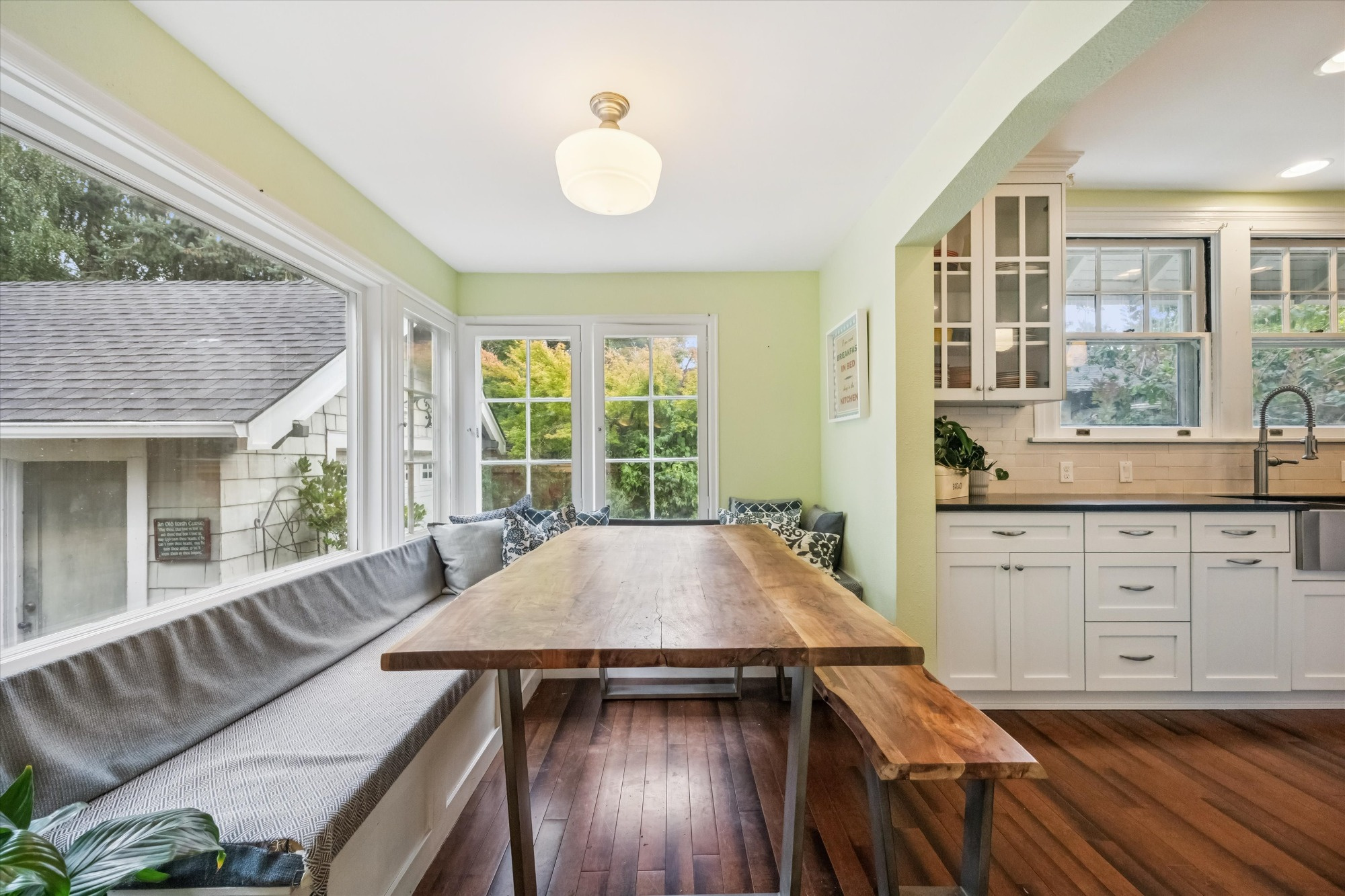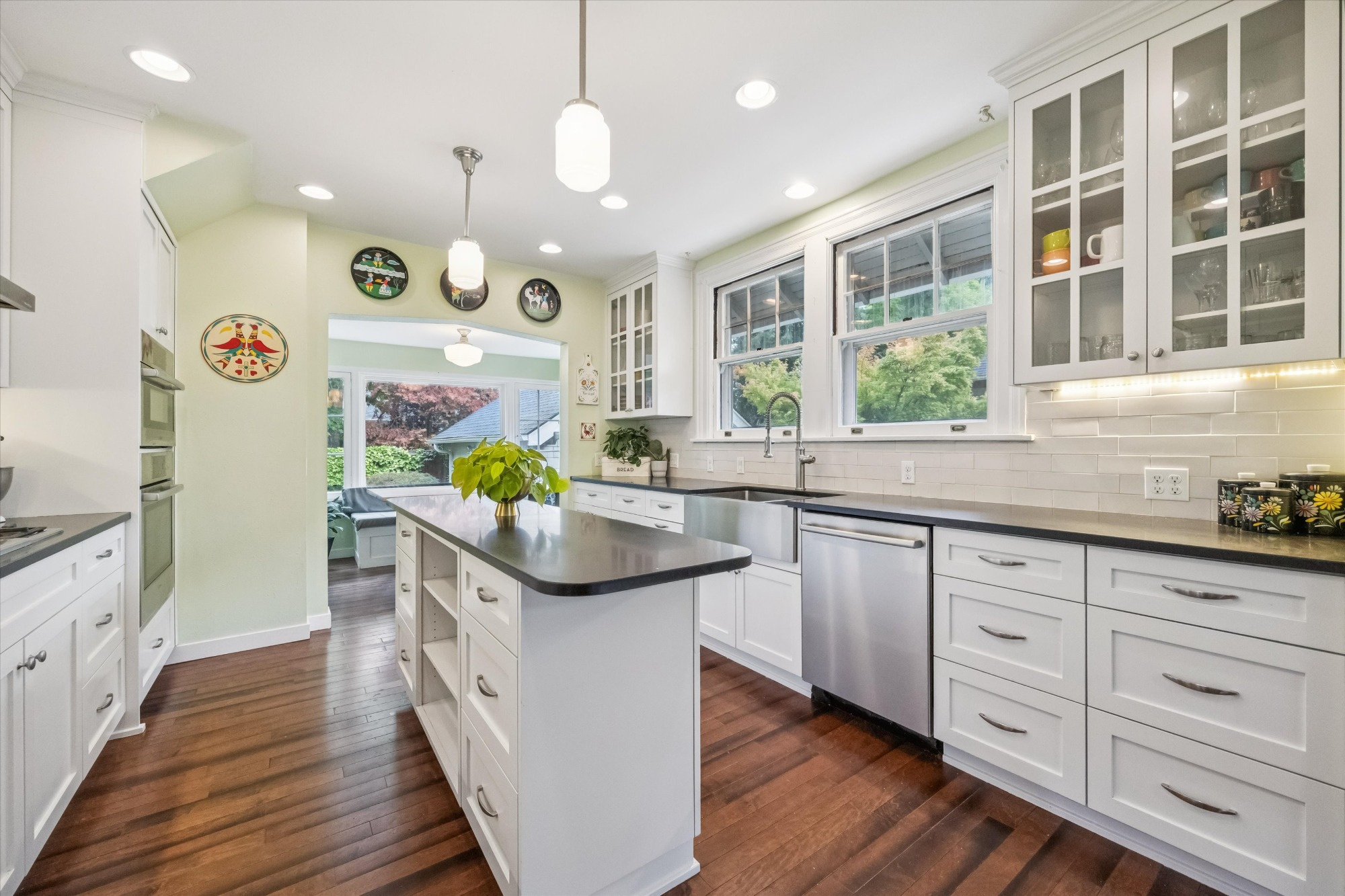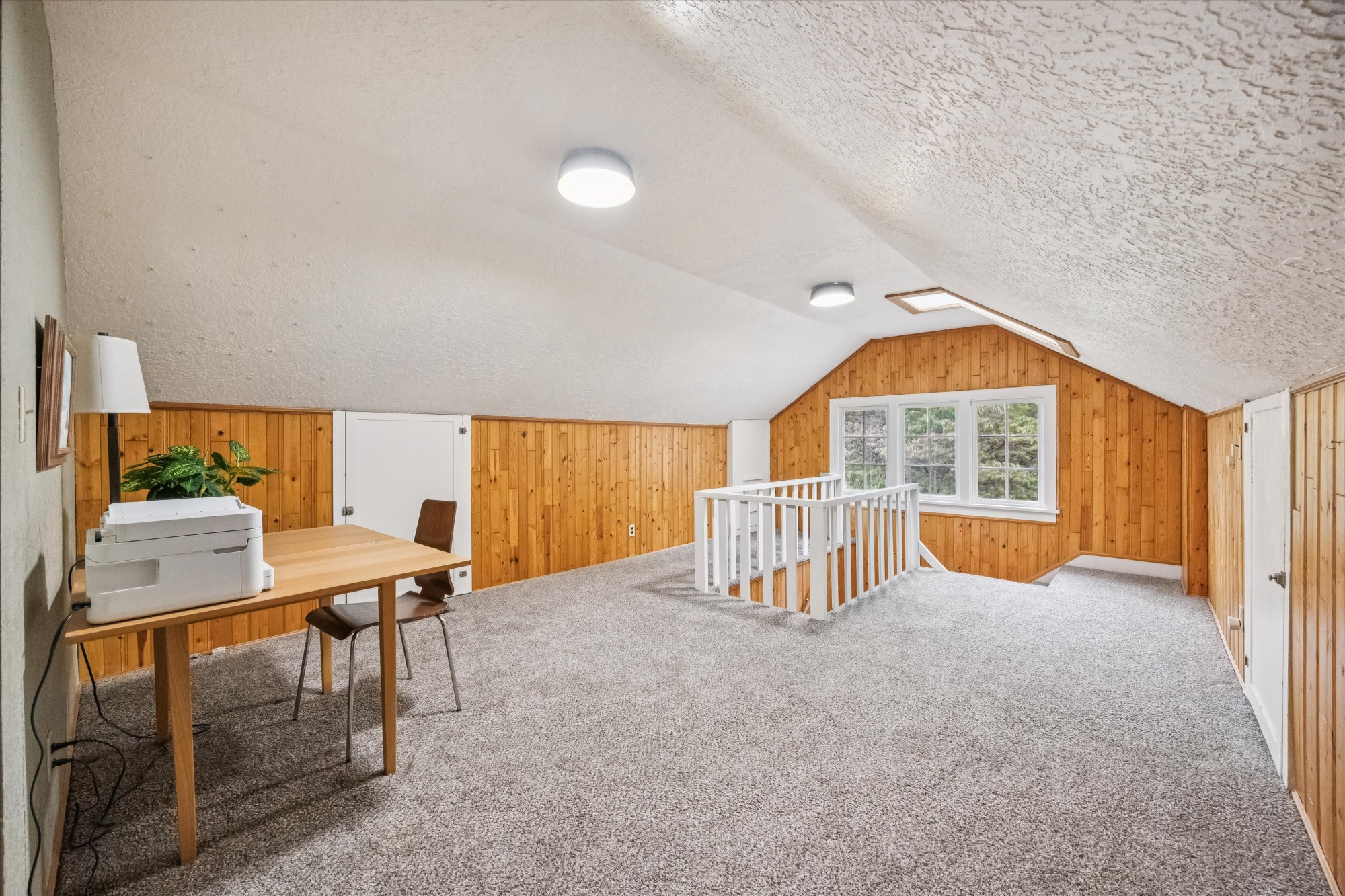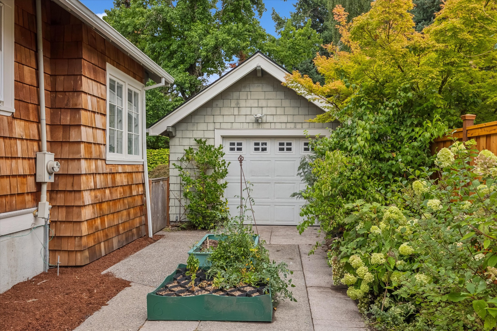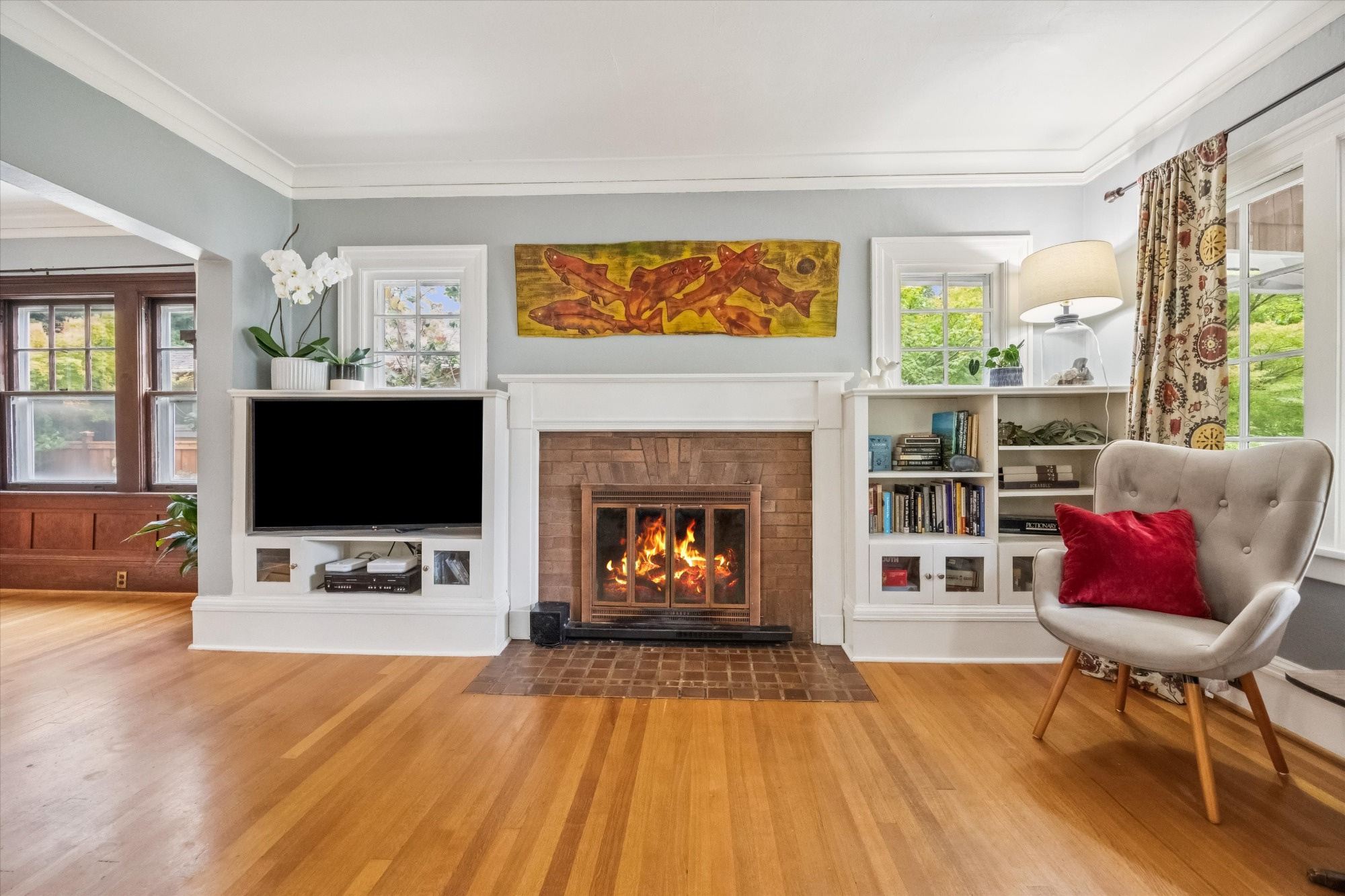 Charming Alameda bungalow with a front porch that dreams are made of and gorgeous stained cedar shake siding. The living room has a wood fireplace and gorgeous wood floors that continue through the rest of the main floor. The dining room features stained wood waincoating and trim. The updated kitchen is a chef's delight with an island, a plethora of storage and high-end Bosch appliances including the gas range. Ann Sacks tile and Schoolhouse Electric lighting in kitchen. Two bedrooms on the main floor with the primary suite upstairs is the perfect layout. The basement features a family room and the fourth (non-conforming) bedroom. Plus lots of storage. The fenced back yard and patio are perfect for summer entertaining. Oversized detached one car garage and private driveway. New roof in 2023. New carpet. Walk Score-84 and Bike Score-88.