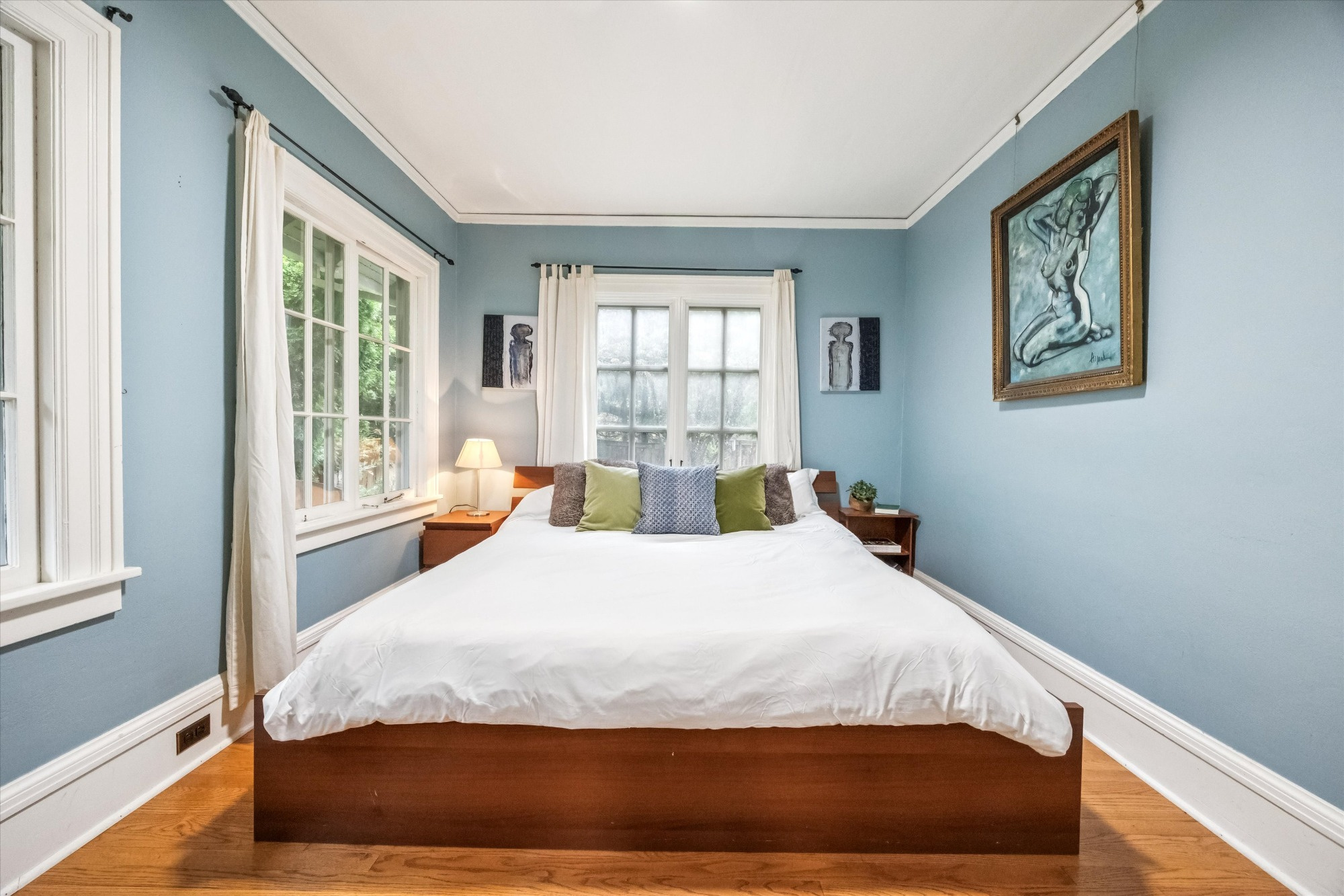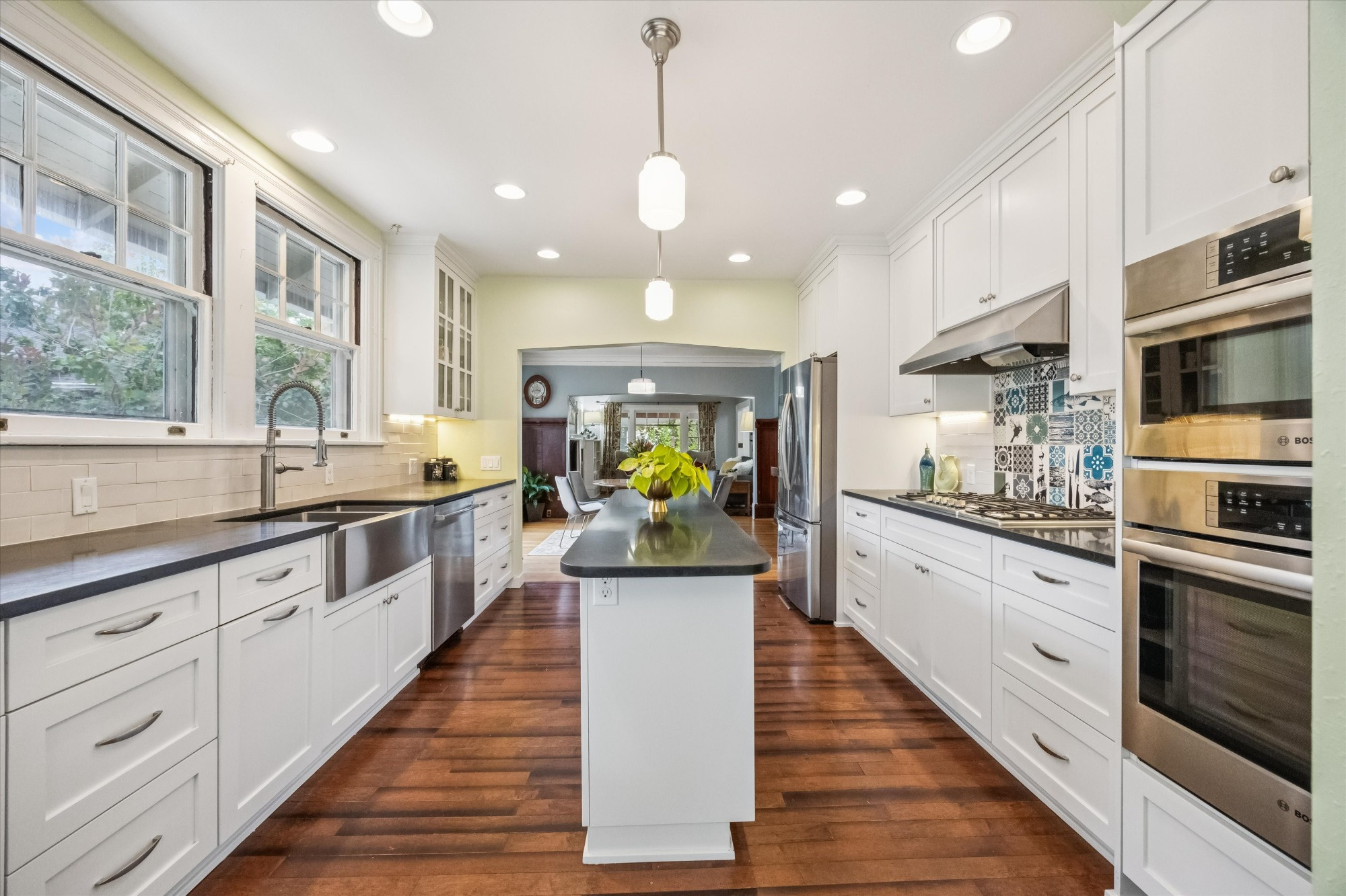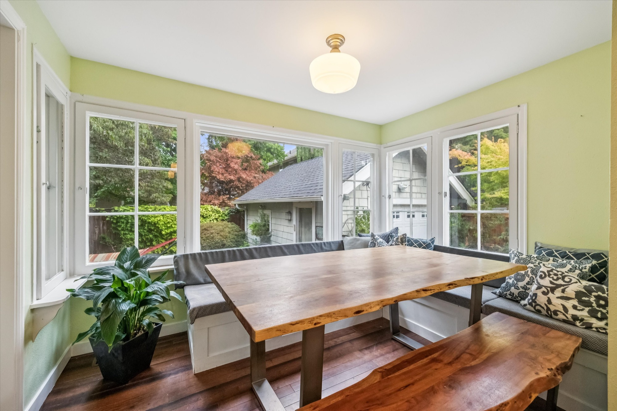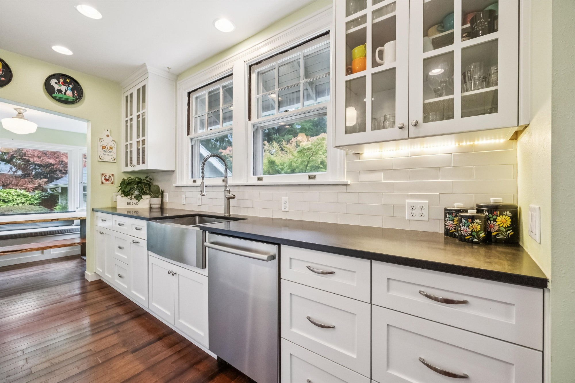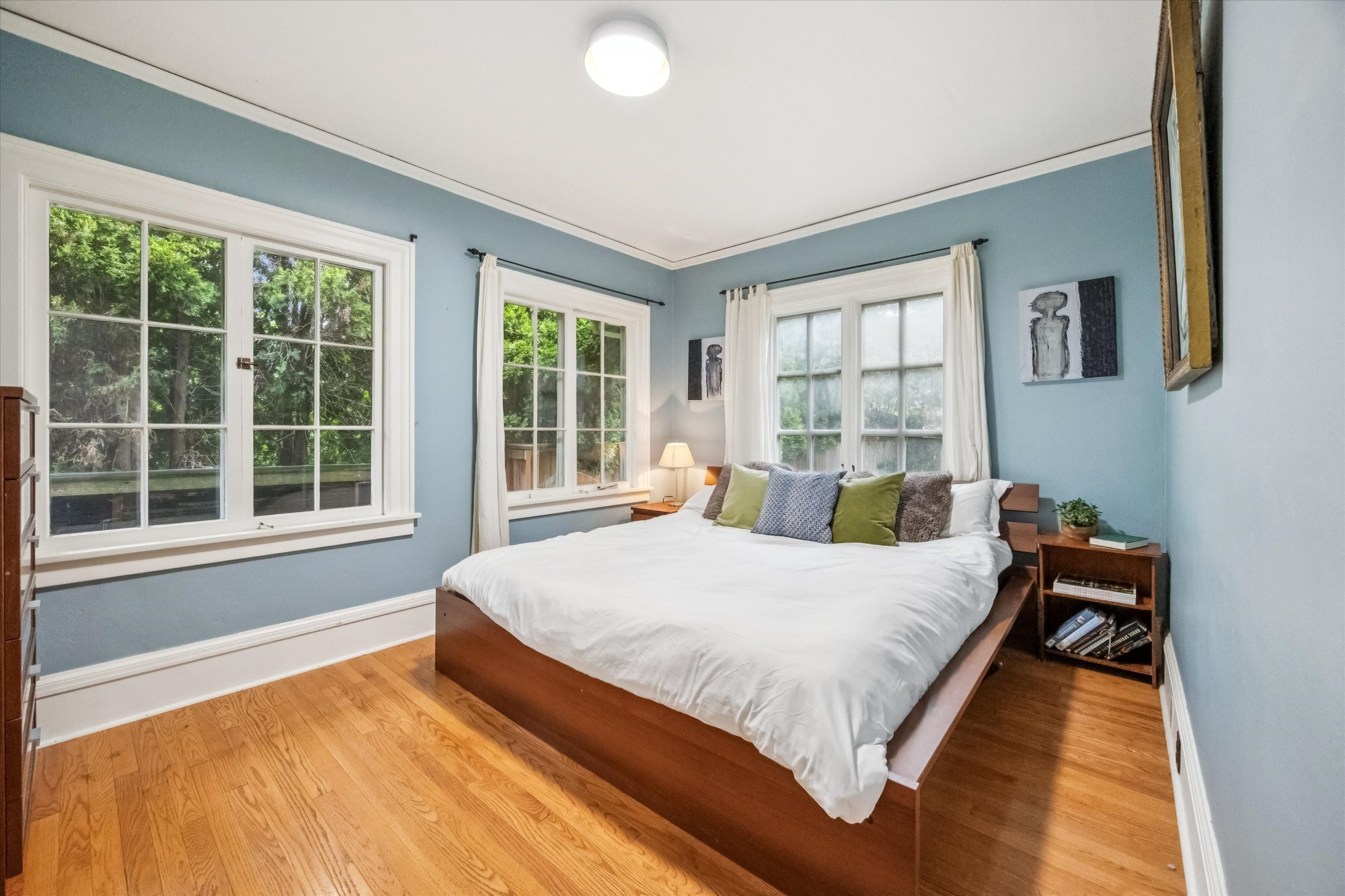 Charming Alameda bungalow with a front porch that dreams are made of and gorgeous stained cedar shake siding. The living room has a wood fireplace and gorgeous wood floors that continue through the rest of the main floor. The dining room features stained wood waincoating and trim. The updated kitchen is a chef's delight with an island, a plethora of storage and high-end Bosch appliances including the gas range. Ann Sacks tile and Schoolhouse Electric lighting in kitchen. Two bedrooms on the main floor with the primary suite upstairs is the perfect layout. The basement features a family room and the fourth (non-conforming) bedroom. Plus lots of storage. The fenced back yard and patio are perfect for summer entertaining. Oversized detached one car garage and private driveway. New roof in 2023. New carpet. Walk Score-84 and Bike Score-88.