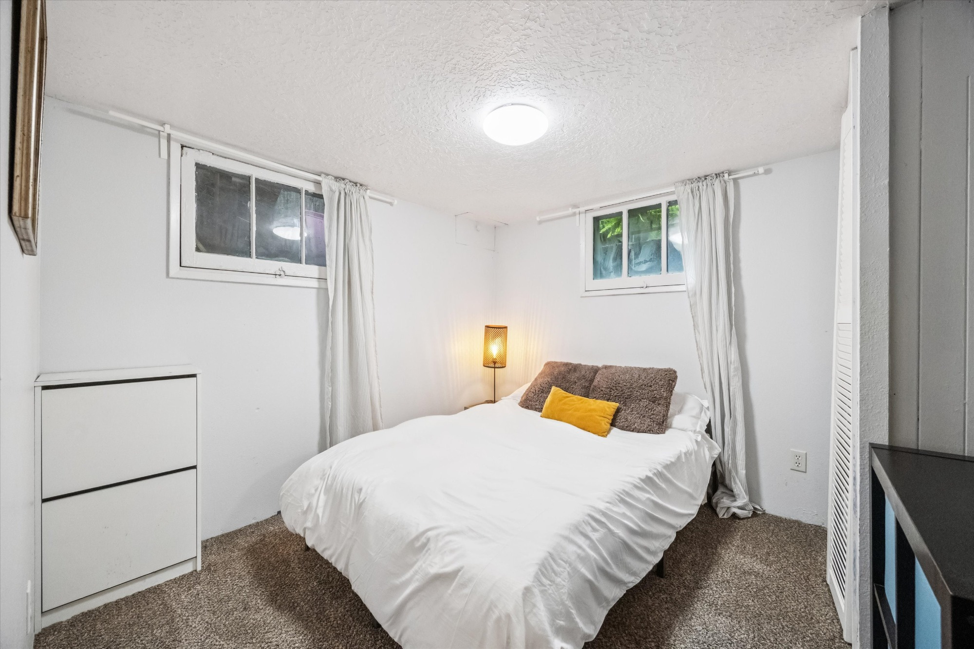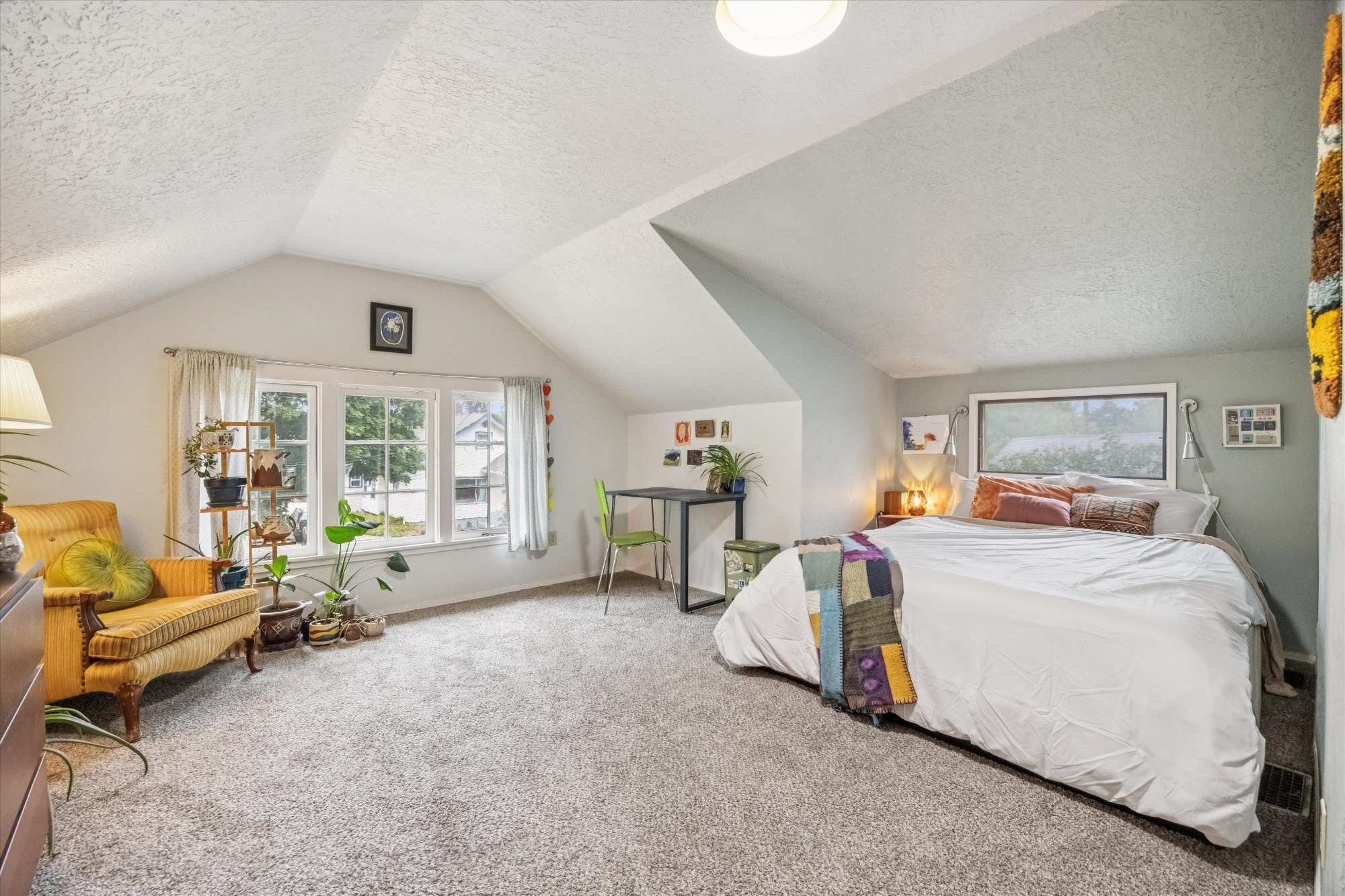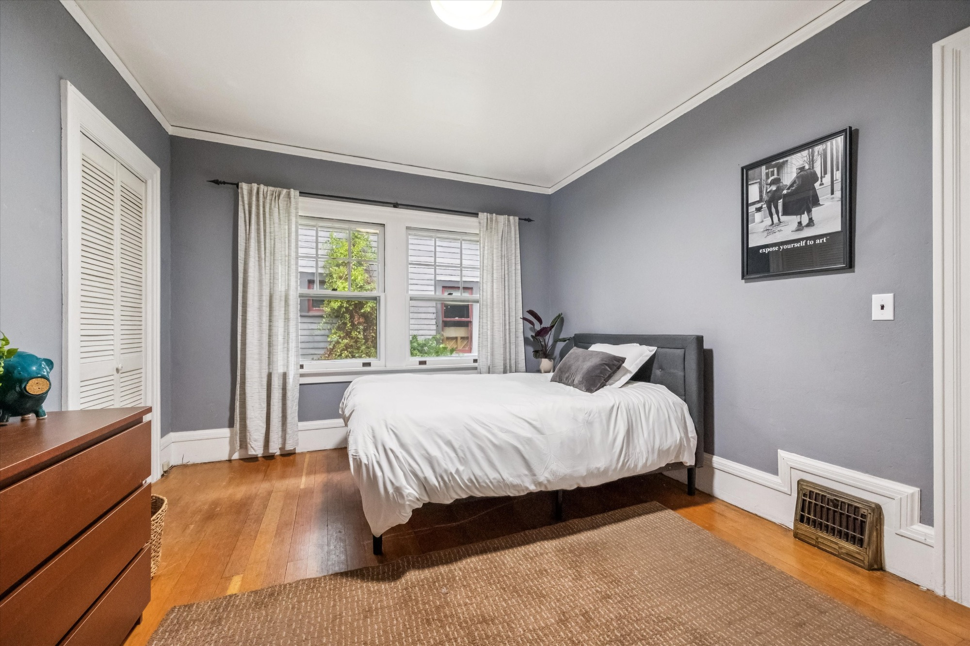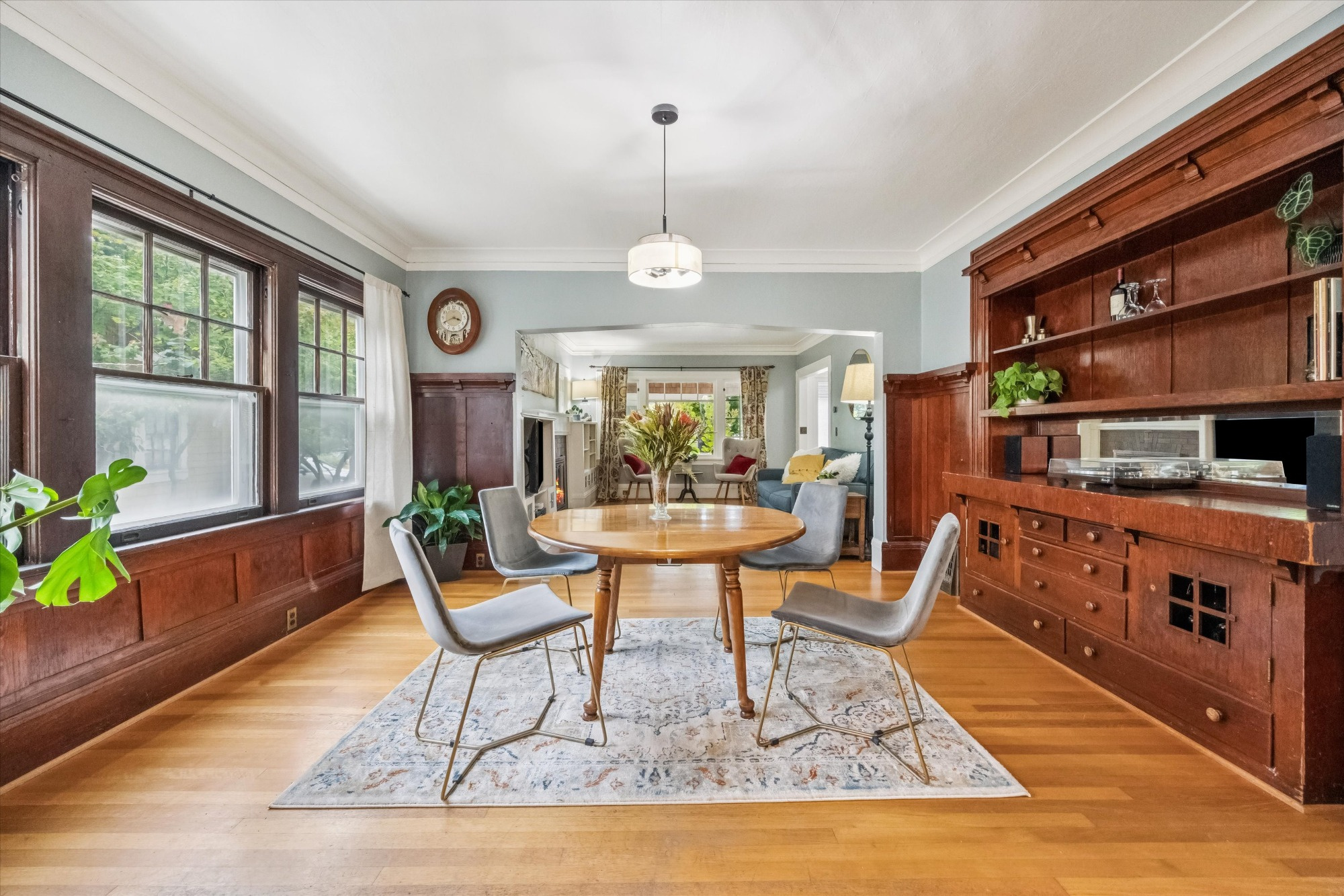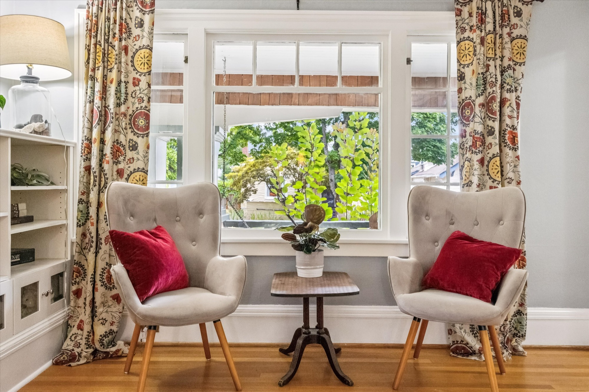 Charming Alameda bungalow with a front porch that dreams are made of and gorgeous stained cedar shake siding. The living room has a wood fireplace and gorgeous wood floors that continue through the rest of the main floor. The dining room features stained wood waincoating and trim. The updated kitchen is a chef's delight with an island, a plethora of storage and high-end Bosch appliances including the gas range. Ann Sacks tile and Schoolhouse Electric lighting in kitchen. Two bedrooms on the main floor with the primary suite upstairs is the perfect layout. The basement features a family room and the fourth (non-conforming) bedroom. Plus lots of storage. The fenced back yard and patio are perfect for summer entertaining. Oversized detached one car garage and private driveway. New roof in 2023. New carpet. Walk Score-84 and Bike Score-88.